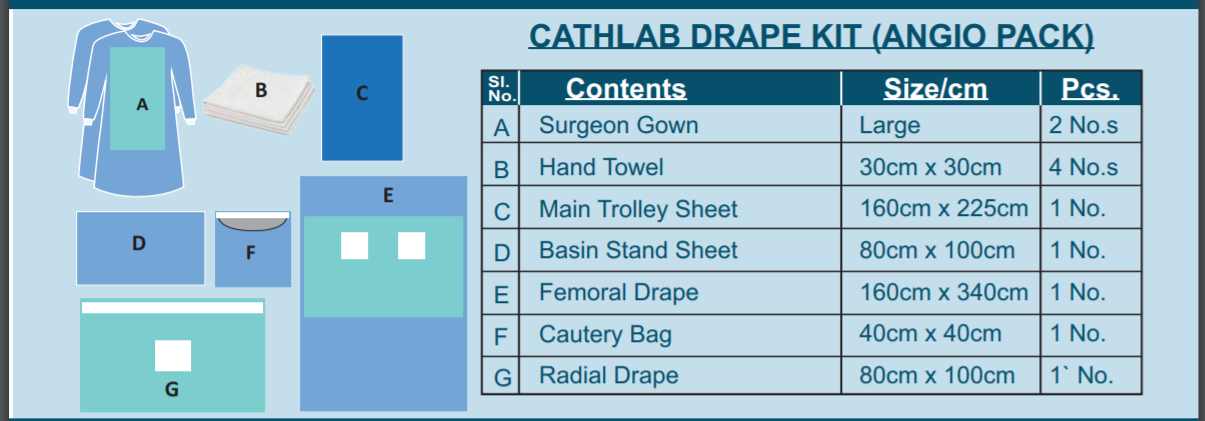 A drape kit used in catheterization labs during angiography or interventional radiology procedures. Maintains a sterile field during invasive procedures.